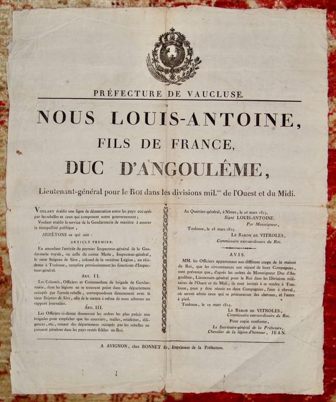 Affiche de la Préfecture de Vaucluse, datée de mars 1815, appelant les officiers de gendarmerie à se mettre en relation avec le sieur Seignan de Sère, inspectuer-général. Au nom de Louis-Antoine, fils de France, Duc d'Angoulême (fils de Charles X). En feuille Bon Avignon Bonnet 1815