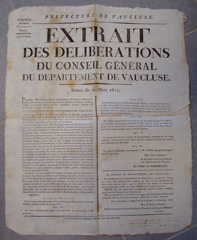 Séance du 29 mars 1815. "… il est imposé extraordinairement deux centimes par franc sur toutes les contributions directes de l'année 1815." En feuille Très bon Avignon Offray 1815 53 x 43 cm