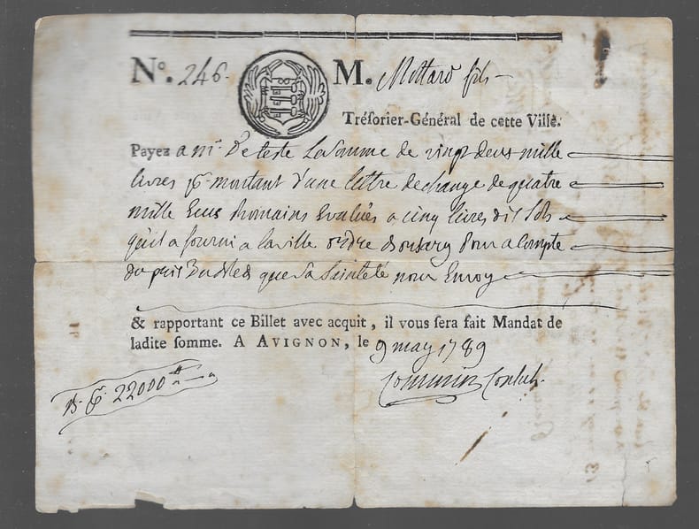 Billet signé par Commin, consul de la ville d'Avignon. Ce billet donne ordre à Mottard fils, trésorier-Général de la ville d'Avignon, de payer la somme de 22000 livres à monsieur De Teste. Commin était alors second Consul. Il est l'auteur des Mémoires pour servir à l'histoire des révolutions de la ville d'Avignon. En feuille. Bon Avignon Ville d'Avignon (bois gravé) 1789
