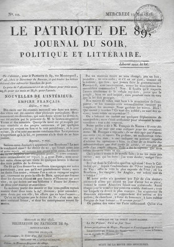 Numéros 10 (10 mai 1815) et 11 (11 mai 1815) de ce journal qui a paru du 1er mai 1815 au 3 juillet 1815. En feuille Bon Paris Imprimerie du Patriote 1815 3 numéros