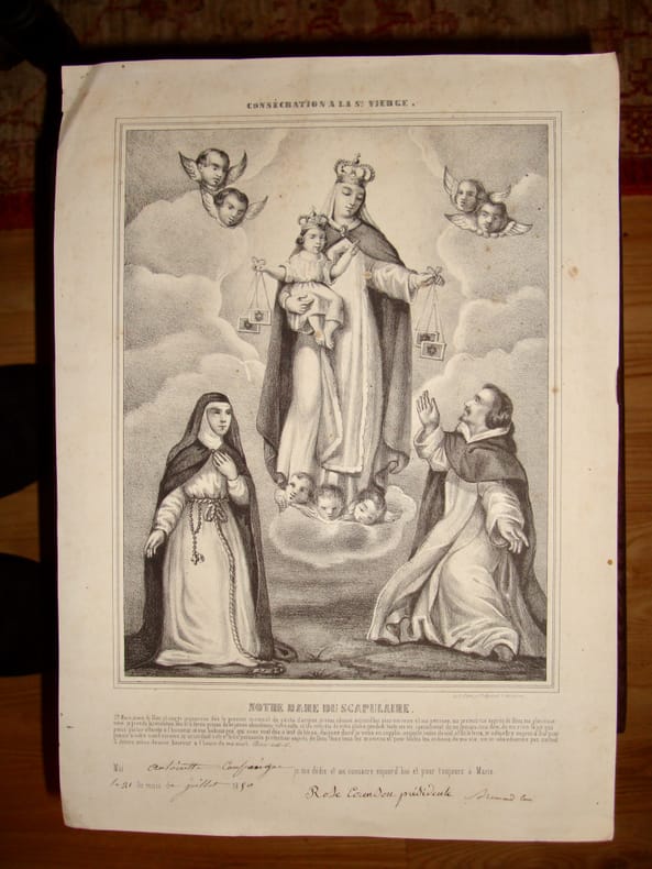 Consécration à la Ste Vierge. Certificat daté 1850, signé de la Présidente Rose Corendon et par Brémond curé. Inconnue à Gagnière. en feuille Bon Avignon Petit 37 x 26 cm