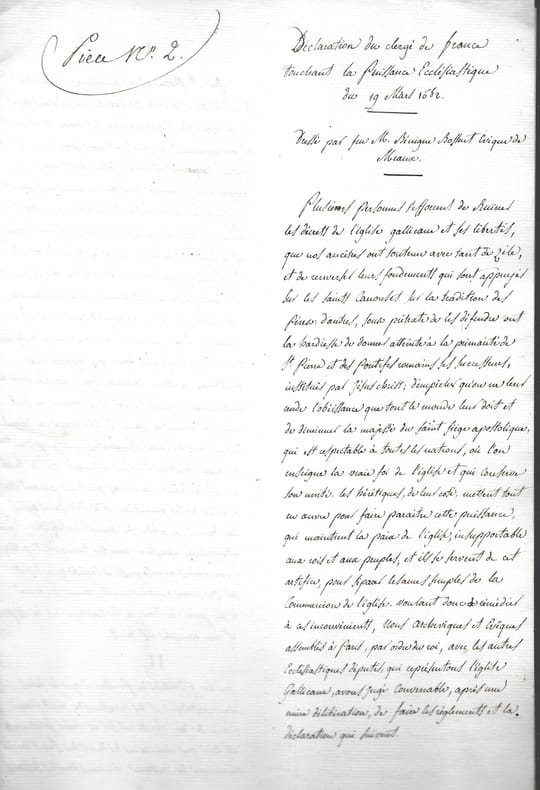 Copie réalisée pour le Cabinet de Louis XVIII. On sait que le Roi embrassait les idées de Bossuet sur les libertés de l'Église gallicane. en feuilles sur papier filigrané L & B Très bon Paris 1814