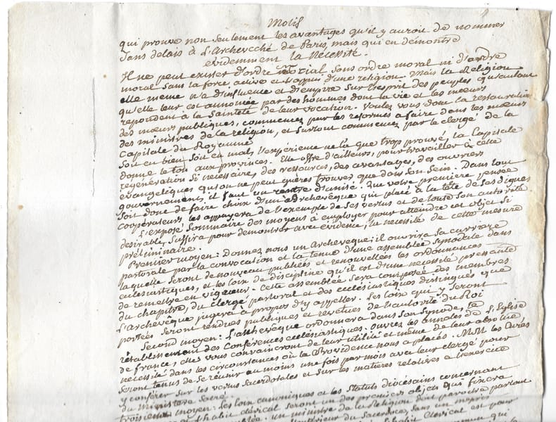 Mémoire autographe pour le rétablissement immédiat de l'Archevêché de Paris. En fait, l'objet de ce mémoire est plutôt d'indiquer les moyens de réformer les mœurs ecclésiastiques. en feuille Très bon Paris 1815