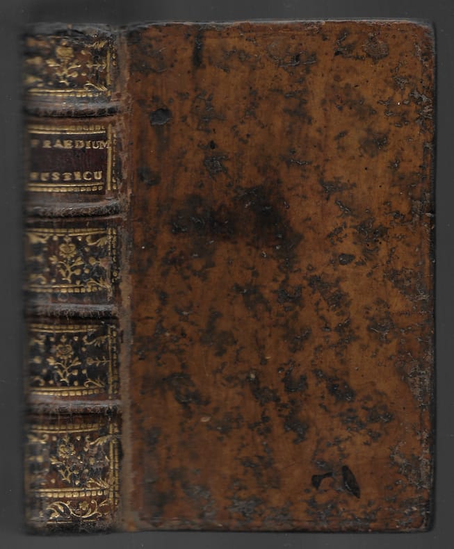 Nova editio auctior et emendatior. apud Petrum Robert, Tolosae, 1730. In-24 gr. (mm. 142x82), p. pelle bazana coeva, decoraz. e tit. oro al dorso (restauri per picc. manc.), tagli rossi, 4 cc.nn., 320 pp.num., 3 cc.nn., con una bella antiporta incisa che raffigura attrezzi agricoli; ornato da graziose testatine e grandi iniziali in silografia, molto ben illustrato da 16 tavv. f.t., inc. in rame. "Prima edizione completa dei 16 canti".<br>Cfr. Ceresoli, p. 542: Il "Praedium Rusticum", che fu assai diffuso nel XVIII sec. ed ebbe molte ristampe, è una raccolta di 16 poemi sui lavori e i piaceri della vita campestre, poemi che vennero composti in diverse riprese, e volta per volta riuniti, sino all'edizione completa (1730). La prima, latina, è del 1696 ed è incompleta.. Segnaliamo fra i canti: il 14° "Stagna" dedicato alla pesca ed il 16° "Vivarium", alla caccia - Brunet,V,1075.<br>Solo lievi fiorit. ma complessivamente esemplare ben conservato.