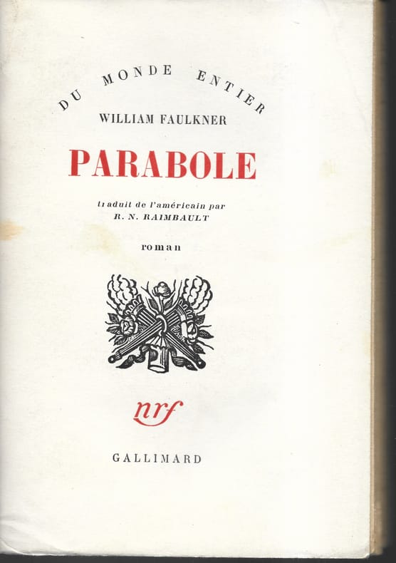 Edition originale de la traduction française. Un des 70 exemplaires numérotés du tirage sur vélin pur-fil Lafuma-Navarre (seul papier). L'exemplaire a conservé de grandes marges. ''Les critiques ont compris dès sa parution que cette œuvre constituait l'effort le plus ambitieux de son auteur. En octobre 1948, Faulkner notait à propos de Parabole : «C'est l'histoire du Christ dans l'armée française, un caporal et une escouade de douze hommes, un général qui est l'Antéchrist, et qui l'attire au sommet d'une colline pour lui offrir le monde. Symbolique et irréel... Le corps du caporal est choisi pour celui du soldat inconnu. Le Christ revit dans la foule.» Parabole est une métaphore : «Quand le dernier glas du destin aura sonné et disparu du dernier et dérisoire rocher suspendu inamovible dans le dernier couchant rouge», disait Faulkner en parlant de l'homme, «il y aura quand même un bruit, un seul : celui de sa petite et inépuisable voix, parlant encore.» Faulkner tente ici l'impossible : élever cette «petite voix» de l'écrivain perdu dans un siècle d'aliénation à la puissance des grandes orgues de l'humanisme.'' Dos et marge des plats insolés. Plats présentant par ailleurs quelques rousseurs. Du reste, belle condition.