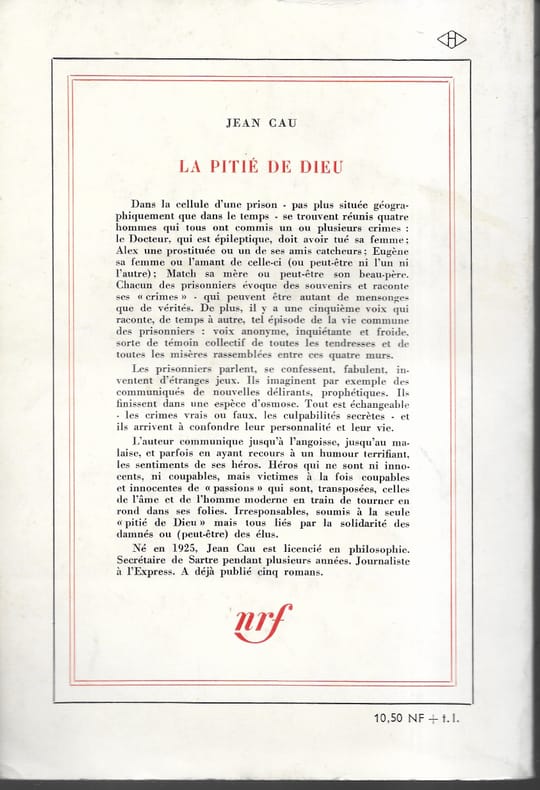 PRIX GONCOURT 1961. Envoi autographe signé : « En très cordial hommage de / Jean Cau » L'intrigue de La pitié de dieu, prix Goncourt pour l'année 1961, n'est pas sans évoquer le Huis clos sartrien : quatre hommes ayant tous commis un crime partagent une cellule de prison. Jean Cau (1925-1993) entama sa carrière dans les lettres comme secrétaire de Jean-Paul Sartre. S'il s'éloigna peu à peu de ses positions, il continua de clamer son admiration et sa gratitude envers l'auteur de La nausée. Il travailla ensuite comme journaliste pour L'Express, le Nouvel Observateur, le Figaro et Paris Match. Parolier, romancier, dramaturge, il en surprit plus d'un en adoptant, à partir des années 60, des positions politiques bien éloignées de celles de la gauche sartrienne à laquelle il s'était rallié. Achevé d'imprimer à la date de janvier 1962. Plis au dos, piqûres et taches d'encre bleue sur la couverture, décharges d'encre à quelques pages.