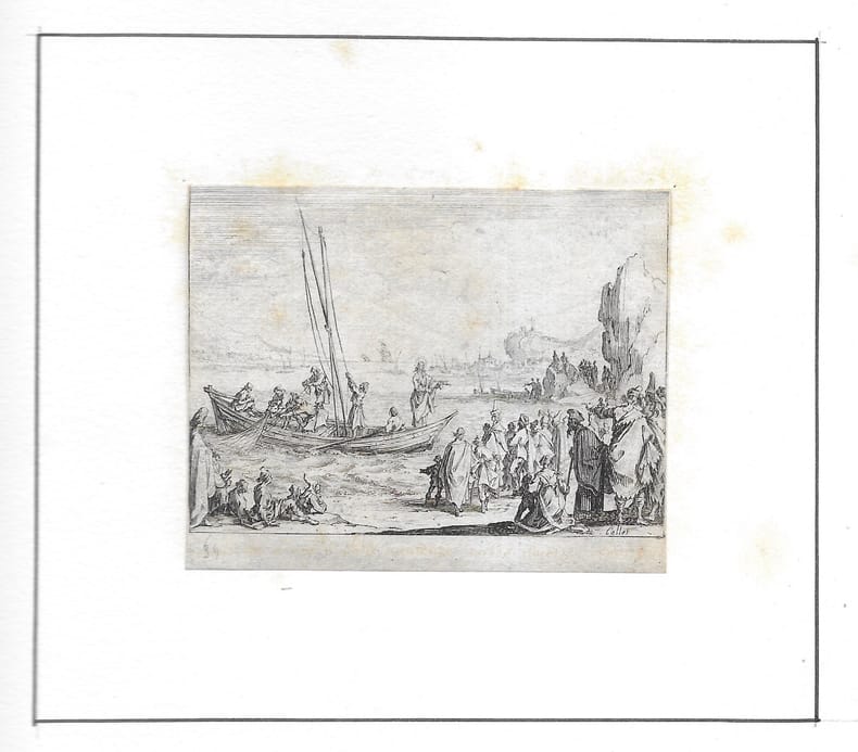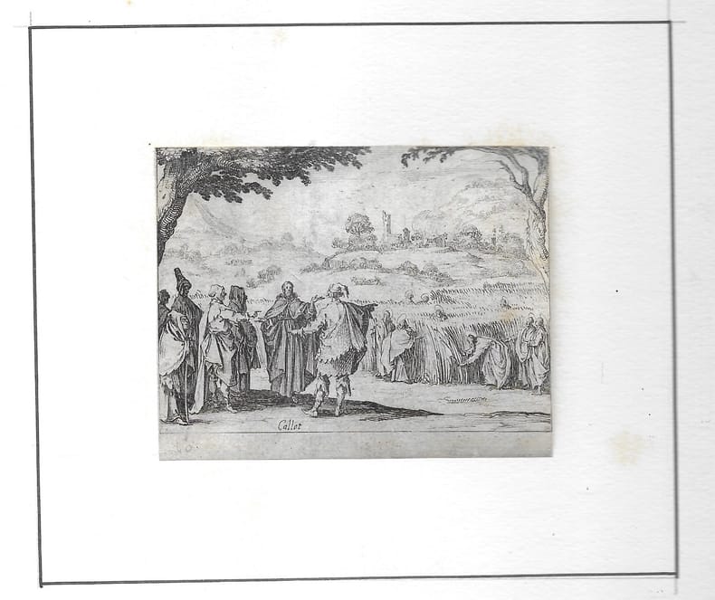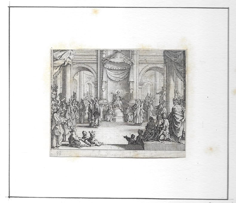Suite de 5 estampes (sur 11). Titre (par Abraham Bosse); Jésus-Christ au mimieu des docteurs (1er état rarissime); Il prêche la foule assemblée sur le rivage de la mer(1er état, le privilège a été coupé, mais avant la mention "Jésus de Simonin"); Il s'entretient avec les Pharisiens ... (1er état, le privilège a été coupé, mais avant la mention "Jésus Pharisœos ob confricatas ..."); Il écrit son jujement sur la femme adultère (1er état, le privilège a été coupé, mais avant la mention "Jésus adductam ad se mulierem adulteram absolvit..."). en feuilles bon