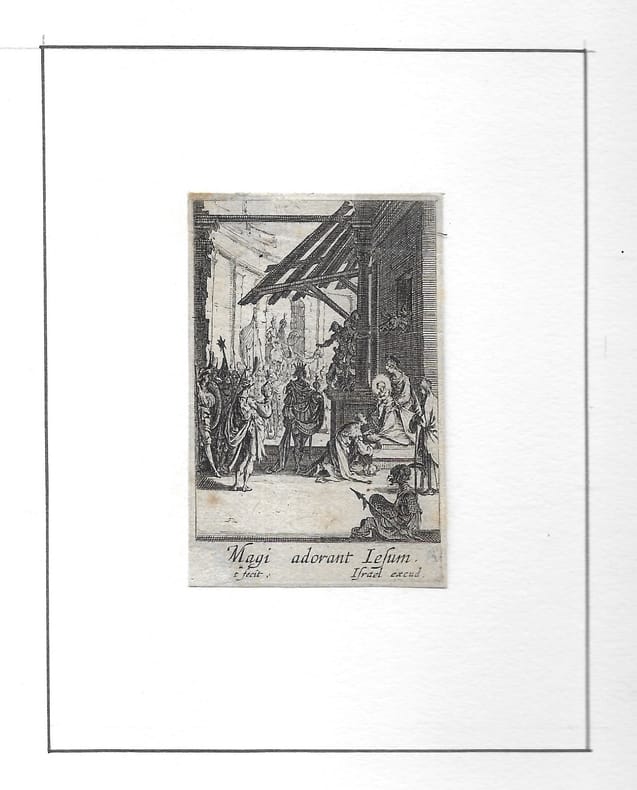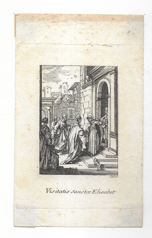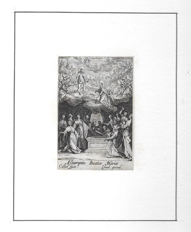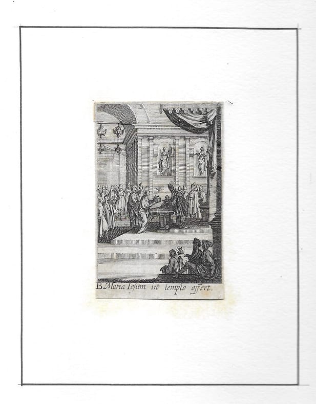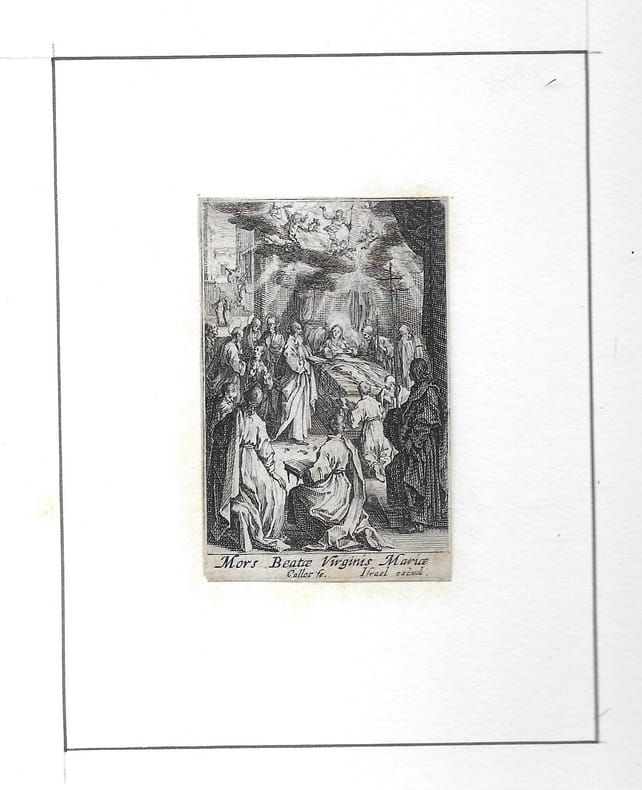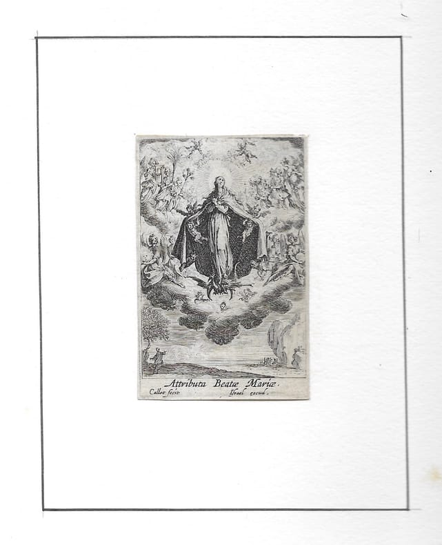 Suite de 8 estampes (sur 14). Elle rend visite à Sainte Elisabeth (copie en contre-partie); Elle présente son fils (copie en contre-partie); Elle l'offre à l'adoration des Mages (2è état sur 2); Elle fuit en Égypte (2è état sur 2); Elle meurt (2è état sur 2); On l'ensevelit (2è état sur 2); Elle fait son Assomption (2è état sur 2); L'Immaculée Conception (2è état sur 2). en feuilles bon