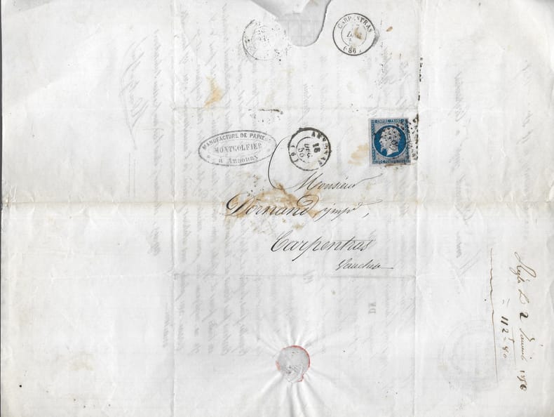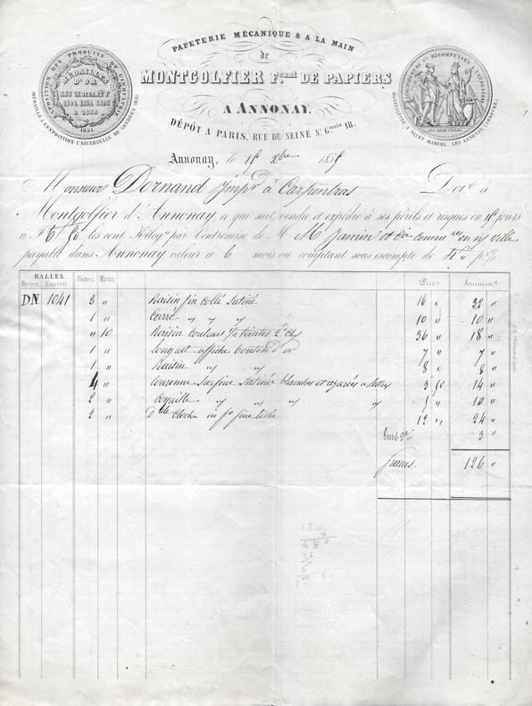 2 facture et 1 lettre de la fabrique de papiers MONTGOLFIER à Annonay. Factures adressées à un papetier de Carpentras. Signatures autographe de Montgolfier. Timbres Empire 20c bleu. en feuille bon Annonay 1857