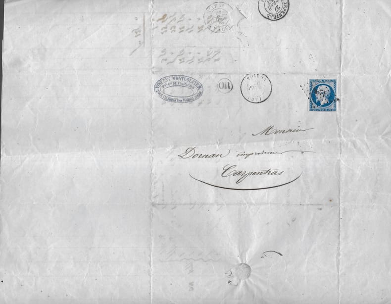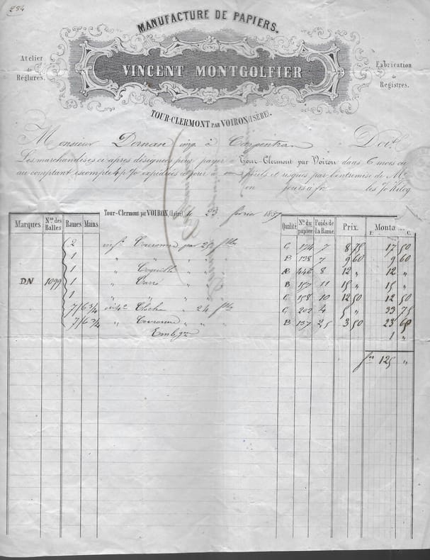 Facture de la fabrique de papiers Vincent MONTGOLFIER à Tour-Clermont (Voiron). Facture adressée à un papetier de Carpentras. Signature autographe de Montgolfier. Timbre Empire 20c bleu. en feuille bon Annonay 1857