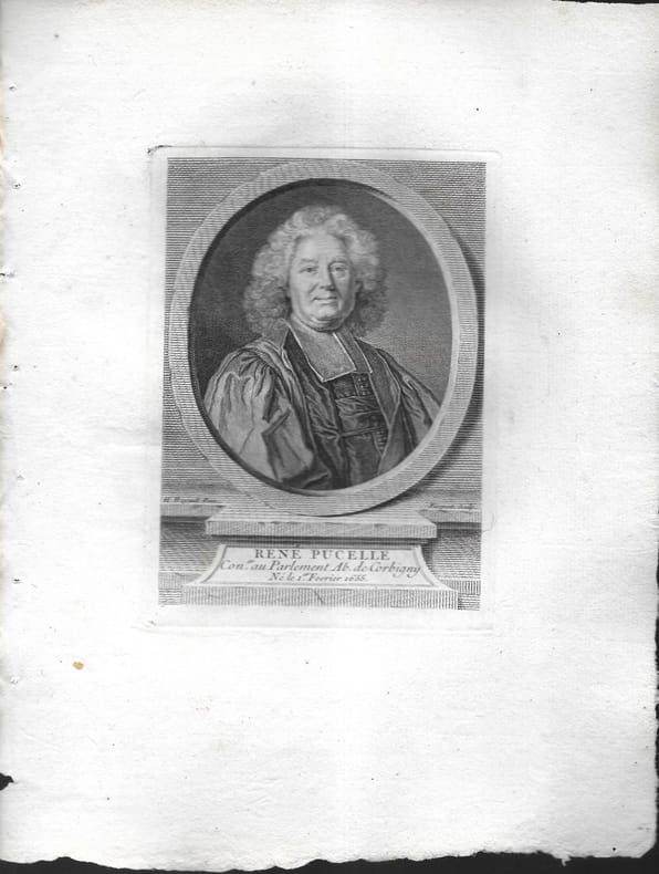 Magistrat français né et mort à Paris (1655-1745), il était le neveu du Maréchal de Catinat. Après quelques campagnes sous les ordres de son oncle, il se fit recevoir sous-diacre à Paris, et devint conseiller clerc au Parlement de Paris (1684). Travailleur et intègre, il obtint l’abbaye de St Léonard de Corbigny et fut nommé membre du Conseil de conscience par le Régent. Il prit le parti des jansénistes et se fit le défenseur des miracles opérés par le diacre Pâris et essaya d’entrainer le Parlement dans ce sens. Il fut désavoué et exilé dans son abbaye. Plus tard il put réintégrer le Parlement. On a de lui des Discours fort rigoureux. Issu d’une famille de Lyonnais (son père Pierre était né à Loire dans le Lyonnais), Pierre-Imbert Drevet, formé par son père artiste-graveur célèbre, devint lui aussi un graveur fort apprécié et se fit une belle réputation pour ses portraits. Son portrait de René Pucelle d’après Hyacinthe Rigaud, est plus riche que le tableau : il a ajouté un décor et les vêtements sont plus nets, enfin il a ajouté les armes de René Pucelle. Ce portrait est probablement l’un des derniers qu’il ait gravé, il est daté de 1739 et Pierre-Imbert Drevet est mort le 27 avril 1739. Une petite éraflure, sinon cuivre en très bon état de conservation.