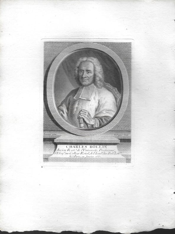 complet en deux volumes in-quarto, 37x22cm, reliés pleine basane époque, reliures à restaurer, les corps des ouvrages restant bien solides. Tome I :684pp, Tome II 676pp Frontispice gravé par D. Coffin d'après C. COYPEL, tête-de-chapitre dessinée et gravée par Jean-Philippe LE BAS, lettrines. Charles Rollin (Paris, 1661-1741), fils d'un coutelier parisien, boursier au collège du Plessis, y enseigne très jeune la rhétorique avant d'occuper la chaire d'éloquence au Collège de France. De 1669 à 1712 il est principal au collège de Beauvais ; à deux reprises - 1704 et 1720 - il est recteur de l'Université. Mais ses convictions et ses activités jansénistes l'amènent à quitter l'enseignement. Il compose alors son célèbre traité "De la manière d'étudier et d'enseigner les Belles-Lettres", ouvrage plus connu sous le titre abrégé de "Traité des études". Écrite à la fin de sa vie, alors qu'il ne peut plus enseigner, cette œuvre dense et originale, dont le sujet porte sur les réformes de l'enseignement, insiste particulièrement sur la généralisation de l'emploi du français au détriment du latin, et sur l'enseignement de l'histoire. Ex-libris 1740. A Paris, chez la Veuve Estienne