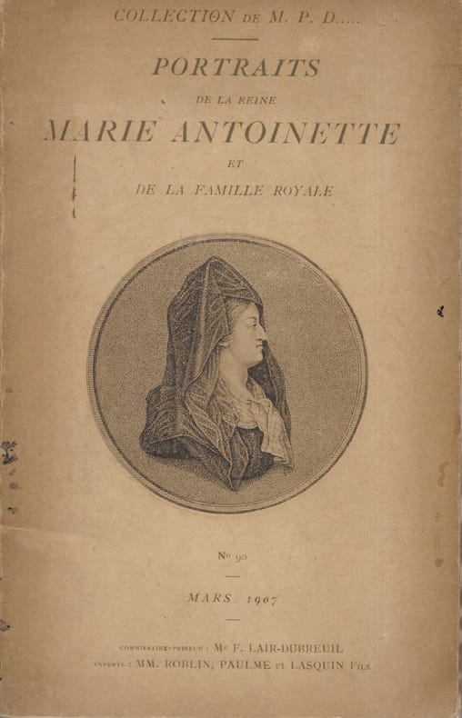 1 vol. in-8 reliure pleine toile recueillant les titres suivants : Catalogue des Objets ayant appartenu à la Reine Marie-Antoinette et à la Famille Royale de France composant la collection de M. Alvin-Beaumont dont la vente aura lieu Hôtel Drouot le 7 juin 1905, Me Maurice Delestre, assisté de Loys Delteil, 13 pp. / Collection Fonteneau. Estampes anciennes. Vente du 12 décembre 1912, Me André Desvouges, 31 pp. / Estampes, principalement de l'Ecole Française du XVIIIe sièle, Hôtel Drouot 27 et 28 novembre 1912, Lair-Dubreuil, Paulme et LAsquin, 37 pp. / Estampes anciennes du XVIIIe siècle. Vente des 2 & 3 Avril 1913, André Desvouges, M. A. Geoffroy expert, 83 pp. / Catalogue d'une collection importante de Portraits anciens classés par ordre de graveurs, en vente aux pris marqués chez Godefroy Mayer, Paris, 167 pp. / Epoque de Louis XVI Révolution Française Napoléon Ier et son temps Restauration. Catalogue d'une Collection importante de Portraits & de Pièces historiques en vente au prix marqués chez Godefroy Mayer, marchand d'estampes, Catalogue n°21, 114 pp. / Catalogue d'une Collection importante d'Estampes historiques, de Vues et de Portraits, en vente au prix marqués chez Godefroy Mayer, marchand d'estampes, Catalogue n°22, 73 pp. / Catalogue d'Estampes des XVIe XVIIe et XVIIIe siècles. Oeuvres de Aldegrever, Beham, Bosse, Callot, Drevet, Dürer, Edelinck, Lancret, Lavreince, Ostade, Pencz, Rembrantd, Israël Silvestre, Martine Schöngauer, Watteau, Zazinger, etc. 1er Juillet 1912 Georges Rapilly, Paris, 54 pp. / Estampes anciennes et modernes, Georges Rapilly, 20 janvier 1913 N°124, 38 pp. / Héliogravures Amand-Durand. Estampes des XVe, XVIe et XVIIe siècles, Georges Rapilly, Paris, 36 pp. / Estampes des XVe, XVIe et XVIIe siècles,reproduites par Héliogravures Amand-Durand, Georges Rapilly, Paris, 55 pp. /