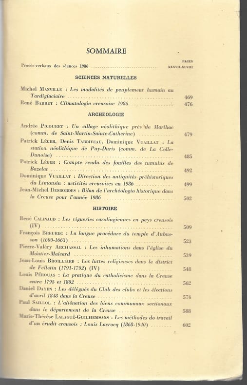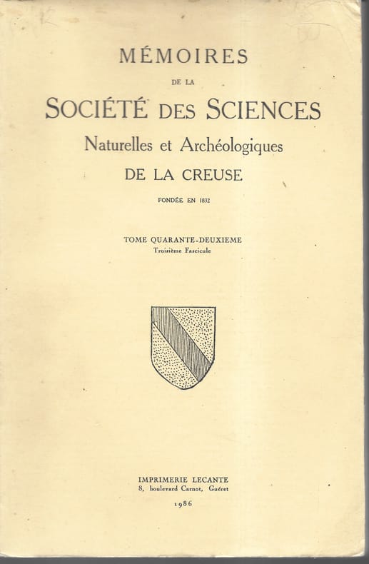 Société Des Sciences Naturelles et Archéologiques De La Creuse 16 x 24,5 Guéret 2013 Broché, dos carré, 558 p. Illustrations. Années 2012/2013. Sommaire: Archéologie. Site de taille de clous à Clugnat (Pasty) ; notes sur l'âge du bronze (Léger), l'aureus de Néron à Leychameau ; commune de Ceyroux (Bardon, Léger) ; la villa de Couliniege à Flayat (Ganne) ; crypte de l'église de La Souterraine (Boulesteix, Roger) ; site métallurgique de Pisserate (Colliou) ; Margelle de puits monolithe au Moutier-Rozeille et à Jouillat (Le Hello, Gouyet) ; meules gallo-romaines de Malleret-Boussac (Gouyet) ; vestiges sur l'église de Saint-Severin à Vallière (Lelache) ; village des Farges à Vallière (Léger). Histoire. La seigneurie de Brudieu à Saint-Yrieix-la-Montagne (Sudre) ; les troubles de la Ligue dans l'ouest aubussonnais (Champagnat) ; l'entrepreneur Mandonet (Gerbaud) ; la disparition des protestants d'Aubusson (Broilliard) ; les écoles du Monteil-au-Vicomte (Tourte) ; le maçon François Mazet (Dayen) ; Le barrage d'Eguzon et Louis Lacrocq (Léger) ; Les nomades dans la Creuse, 1940-1946 (Moreigne). Histoire de l'art. La Dame à la Licorne de Boussac à Paris (Lorette) ; le décor de la chapelle de Fresselines (Bertrand) ; Francis Chigot, maître verrier (Tandeau de Marsac).Tampon sur la couverture. Exemplaire à l'état quasi neuf.(H3) Livre