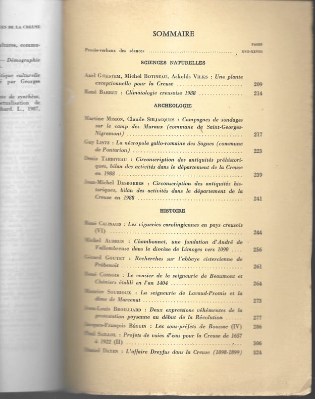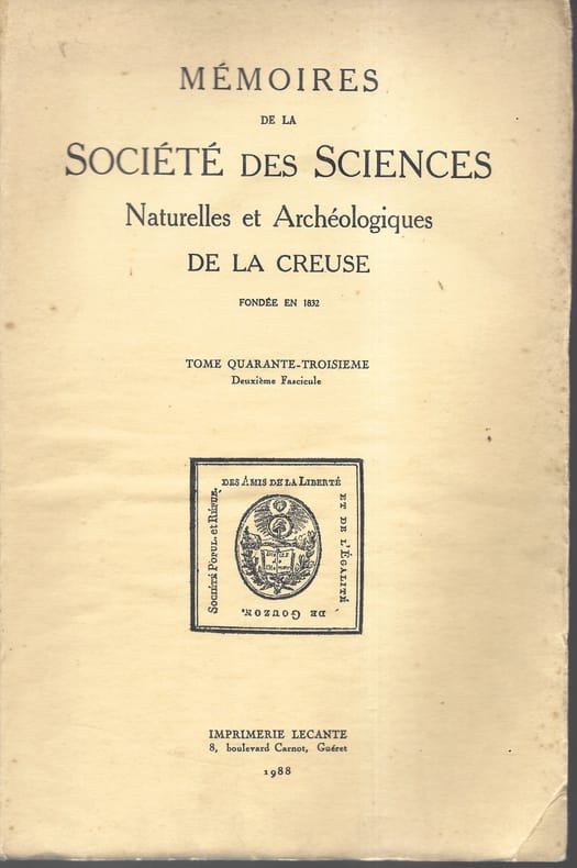 Société Des Sciences Naturelles et Archéologiques De La Creuse 16 x 24,5 Guéret 2013 Broché, dos carré, 558 p. Illustrations. Années 2012/2013. Sommaire: Archéologie. Site de taille de clous à Clugnat (Pasty) ; notes sur l'âge du bronze (Léger), l'aureus de Néron à Leychameau ; commune de Ceyroux (Bardon, Léger) ; la villa de Couliniege à Flayat (Ganne) ; crypte de l'église de La Souterraine (Boulesteix, Roger) ; site métallurgique de Pisserate (Colliou) ; Margelle de puits monolithe au Moutier-Rozeille et à Jouillat (Le Hello, Gouyet) ; meules gallo-romaines de Malleret-Boussac (Gouyet) ; vestiges sur l'église de Saint-Severin à Vallière (Lelache) ; village des Farges à Vallière (Léger). Histoire. La seigneurie de Brudieu à Saint-Yrieix-la-Montagne (Sudre) ; les troubles de la Ligue dans l'ouest aubussonnais (Champagnat) ; l'entrepreneur Mandonet (Gerbaud) ; la disparition des protestants d'Aubusson (Broilliard) ; les écoles du Monteil-au-Vicomte (Tourte) ; le maçon François Mazet (Dayen) ; Le barrage d'Eguzon et Louis Lacrocq (Léger) ; Les nomades dans la Creuse, 1940-1946 (Moreigne). Histoire de l'art. La Dame à la Licorne de Boussac à Paris (Lorette) ; le décor de la chapelle de Fresselines (Bertrand) ; Francis Chigot, maître verrier (Tandeau de Marsac).Tampon sur la couverture. Exemplaire à l'état quasi neuf.(H3) Livre