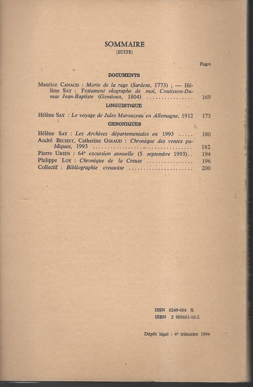 Société Des Sciences Naturelles et Archéologiques De La Creuse 16 x 24,5 Guéret 2013 Broché, dos carré, 558 p. Illustrations. Années 2012/2013. Sommaire: Archéologie. Site de taille de clous à Clugnat (Pasty) ; notes sur l'âge du bronze (Léger), l'aureus de Néron à Leychameau ; commune de Ceyroux (Bardon, Léger) ; la villa de Couliniege à Flayat (Ganne) ; crypte de l'église de La Souterraine (Boulesteix, Roger) ; site métallurgique de Pisserate (Colliou) ; Margelle de puits monolithe au Moutier-Rozeille et à Jouillat (Le Hello, Gouyet) ; meules gallo-romaines de Malleret-Boussac (Gouyet) ; vestiges sur l'église de Saint-Severin à Vallière (Lelache) ; village des Farges à Vallière (Léger). Histoire. La seigneurie de Brudieu à Saint-Yrieix-la-Montagne (Sudre) ; les troubles de la Ligue dans l'ouest aubussonnais (Champagnat) ; l'entrepreneur Mandonet (Gerbaud) ; la disparition des protestants d'Aubusson (Broilliard) ; les écoles du Monteil-au-Vicomte (Tourte) ; le maçon François Mazet (Dayen) ; Le barrage d'Eguzon et Louis Lacrocq (Léger) ; Les nomades dans la Creuse, 1940-1946 (Moreigne). Histoire de l'art. La Dame à la Licorne de Boussac à Paris (Lorette) ; le décor de la chapelle de Fresselines (Bertrand) ; Francis Chigot, maître verrier (Tandeau de Marsac).Tampon sur la couverture. Exemplaire à l'état quasi neuf.(H3) Livre