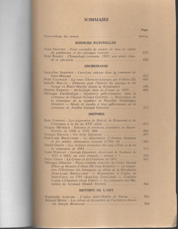 Société Des Sciences Naturelles et Archéologiques De La Creuse 16 x 24,5 Guéret 2013 Broché, dos carré, 558 p. Illustrations. Années 2012/2013. Sommaire: Archéologie. Site de taille de clous à Clugnat (Pasty) ; notes sur l'âge du bronze (Léger), l'aureus de Néron à Leychameau ; commune de Ceyroux (Bardon, Léger) ; la villa de Couliniege à Flayat (Ganne) ; crypte de l'église de La Souterraine (Boulesteix, Roger) ; site métallurgique de Pisserate (Colliou) ; Margelle de puits monolithe au Moutier-Rozeille et à Jouillat (Le Hello, Gouyet) ; meules gallo-romaines de Malleret-Boussac (Gouyet) ; vestiges sur l'église de Saint-Severin à Vallière (Lelache) ; village des Farges à Vallière (Léger). Histoire. La seigneurie de Brudieu à Saint-Yrieix-la-Montagne (Sudre) ; les troubles de la Ligue dans l'ouest aubussonnais (Champagnat) ; l'entrepreneur Mandonet (Gerbaud) ; la disparition des protestants d'Aubusson (Broilliard) ; les écoles du Monteil-au-Vicomte (Tourte) ; le maçon François Mazet (Dayen) ; Le barrage d'Eguzon et Louis Lacrocq (Léger) ; Les nomades dans la Creuse, 1940-1946 (Moreigne). Histoire de l'art. La Dame à la Licorne de Boussac à Paris (Lorette) ; le décor de la chapelle de Fresselines (Bertrand) ; Francis Chigot, maître verrier (Tandeau de Marsac).Tampon sur la couverture. Exemplaire à l'état quasi neuf.(H3) Livre