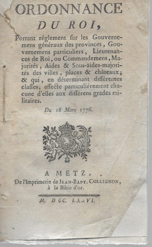 Important ouvrage qui nous donne les traitements des gouverneurs, lieutenant du Roi et autres majors dans les différentes provinces. Petite réparation à la page de titre. Broché. Très bon Metz Collignon 1776 1 volume in-12 (46pp).