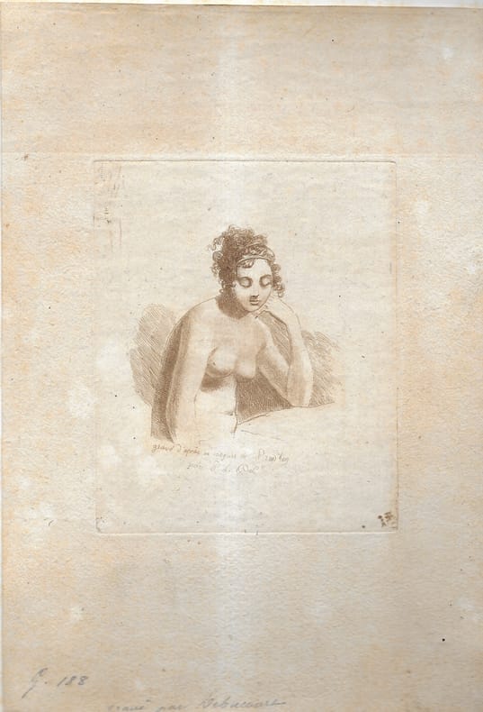 Gravé à l’eau-forte d’après un croquis de Prud’hon. Une jeune femme nue, baissant les yeux, coiffée en papillotes, est représentée à mi-corps, la joue appuyée sur sa main gauche. Signature en bas à la pointe. Eau-forte imprimée en bistre, décrite dans le catalogue de Prud’hon (n° 188, page 296) par E. et J. de Goncourt. Fenaille n° 132. Très belle épreuve, grande de marges ( 27,3 x 19,2). Rare. 14,4 x 11,8 Bon circa 1800