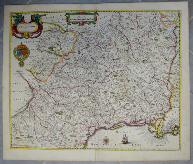 Magnifique carte du Canal royal de Languedoc entre Capestang et l'étang de Thau, de plus de 2,50 mètres de longueur, levée par ordre de Arthur Richard Dillon, archevêque et primat de Narbonne de 1763 à 1790, sous la direction de François Garipuy, ingénieur en chef des États du Languedoc. Elle a été gravée par Nicolas Chalmandrier, et imprimée par Jean-Baptiste François René Dutertre. L'exemplaire a été très finement colorié à l'époque. Cette carte en trois feuilles fait partie d'une grande carte du Canal de Languedoc, composée de quatre parties subdivisées en quinze feuilles. La première partie, composée de trois feuilles, montre le canal entre Toulouse et Renneville, la seconde, en cinq feuilles, entre Renneville et Trèbes, la troisième, en quatre feuilles, entre Trèbes et Capestang, et enfin la quatrième et dernière, en trois feuilles, entre Capestang et l'étang de Thau. Probablement pour pouvoir être vendues individuellement, et parce qu'elles ne peuvent pas être jointes, Chalmandrier a composé une bordure d'encadrement pour chacune des quatre parties, ainsi qu'un cartouche de titre. Les quinze feuilles, qui représentent les 240 km du canal, s'étendent sur plus de 11 mètres de longueur. La carte est décorée d'un superbe cartouche de titre inscrit sur un monument, orné, en tête, des armoiries d'Arthur Richard Dillon et d'insignes archiépiscopaux, avec la devise latine Dum spiro spero (Tant que je respire, j'espère), et en pied, des armoiries du Languedoc. En bas à droite figure un second cartouche, richement décoré d'amours et de guirlandes de fleurs, avec à nouveau les armoiries d'Arthur Richard Dillon, et celles du Languedoc. Dans la Méditerranée voguent deux vaisseaux, trois voiliers et deux barques chargées de rameurs. Les villes principales sont représentées par une citadelle aquarellée en rose, dont la taille varie selon l'importance de la ville ; les étangs, marais et rivières sont aquarellés en bleu-vert. L'échelle est de 2000 toises. Considéré comme l'une des merveilles du règne de Louis XIV, le Canal royal de Languedoc, reliant Toulouse et la Garonne à la Méditerranée, révolutionna le transport fluvial et la circulation dans le Midi. Conçu par l'architecte et ingénieur Pierre-Paul Riquet, le Canal des Mers Océane et Méditerranée, comme il était également appelé, fut construit de 1667 à 1681, et achevé par Vauban en 1693. Jusqu'à dix mille ouvriers participèrent au percement du canal, et à la construction de ses nombreux aqueducs et ouvrages. Il fut renommé Canal du Midi à la Révolution. En 1856, il sera prolongé jusqu’à l’Atlantique par le canal latéral à la Garonne. Le 7 décembre 1996, il est inscrit au Patrimoine mondial de l’humanité. François Garipuy (1711-1782), ingénieur en chef des États du Languedoc, fut directeur des travaux publics de la Sénéchaussée de Toulouse, puis de celle de Carcassonne. Graveur parisien de cartes et plans, Nicolas Chalmandrier a gravé six feuilles de la carte de Cassini, ainsi que des plans de villes françaises et étrangères comme Paris, Montpellier, Madrid ou Gibraltar. L'ingénieur et le graveur ont collaboré sur une autre carte du Canal royal, intitulée Carte générale du Canal Royal de la province de Languedoc, publiée par Laurent Aubert en 1771 (0,49 x 2,14 m). Bel et très rare exemplaire finement aquarellé à l'époque. Infimes rousseurs à l'extrême droite de la carte, mouillure claire dans la marge gauche. Thomas, Introduction à l'histoire générale de Languedoc, des bénédictins Fr.-Claude de Vic et Fr.-Joseph Vaissète, 1853, p. 109, 35 ; Société Languedocienne de Géographie, 1897, p. 161, Feuilles VIII à XXII ; Mémoires de la Société archéologique de Montpellier, Tome troisième, 1850-1854, p. 479, 35 ; Vannereau, Catalogue de l'exposition des cartes anciennes du Languedoc, Actes du quatre-vingt-sixième Congrès national des sociétés savantes, Montpellier, 1961, p. 554, 24.