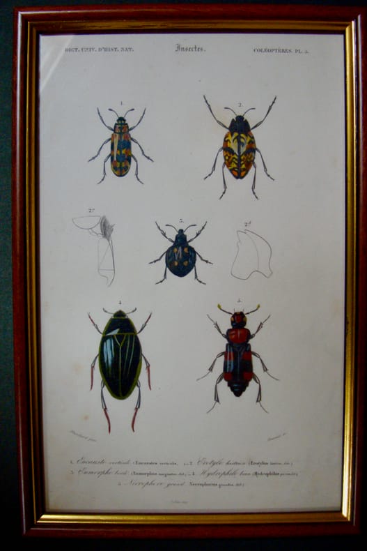 Authentique gravure extraite du Dictionnaire Universel d'Histoire Naturelle par Charles d'Orbigny (Paris, 1849). Encauste - Erotyle - Eumorphe - Hydrophile - Nicrophore Encadré très bon Paris Dictionnaire Universel d’Histoire Naturelle 1849 26 x 18