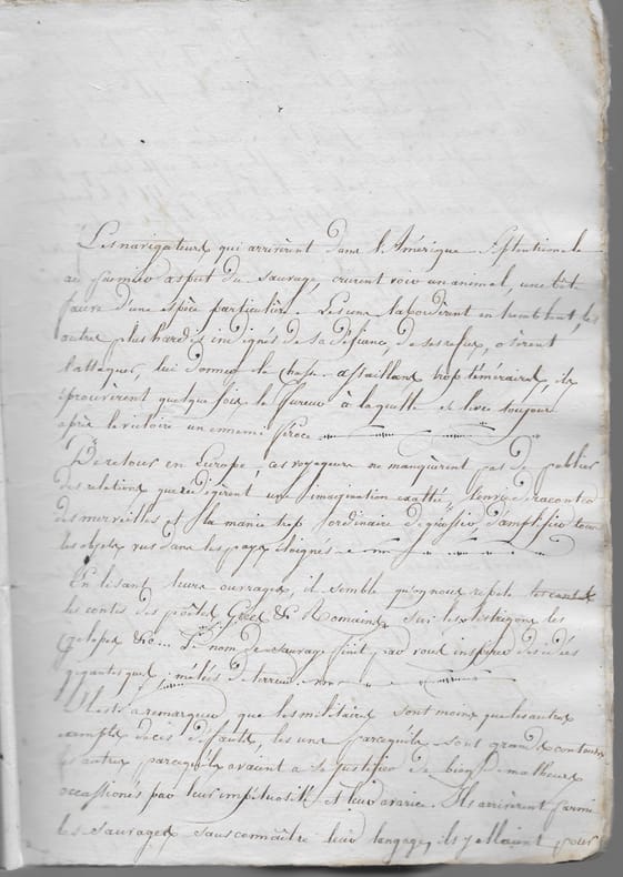 Ébauche d’une histoire des Amériques écrite au tout début XIXè siècle. On y trouve d’intéressants détails historiques sur le comportement des premiers européens débarquant en Amérique. 1 cahier broché de 42 pages in-4°. XIXè siècle.