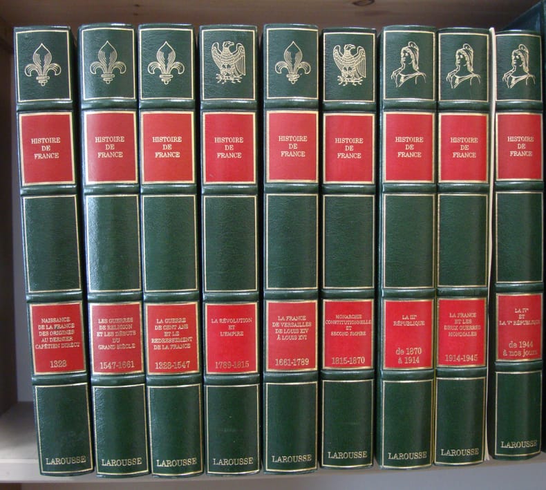 Tome 1: Des Origines à 1610. Illustrée de 980 Reproductions photographiques. 24 Planches en couleurs – 5 Cartes en couleurs – 39 Cartes en noir. Tome 2: De 1610 à nos jours. Illustrée de 1048 Reproductions photographiques. 19 Planches en couleurs – 4 cartes en couleurs – 57 Cartes en noir. Joint Histoire de France Contemporaine: De 1871 à 1913. Illustrée de 1164 Reproductions photographiques. 11 Planches en couleurs – 40 Planches en noir – 2 Cartes en couleurs. 20 Cartes en noir. Paris, Librairie Larousse, 1913. 3 volumes grands in-4 (32,5x25cm) reliés demi chagrin bordeaux, dos à petits-nerfs, ornés de 4 fleurons dorés, titres dorés, quelques décolorations sur les plats des tranches inférieures et éraflure sur le morspeau du 3ème volume.412pp. + 456pp. + II,512pp.