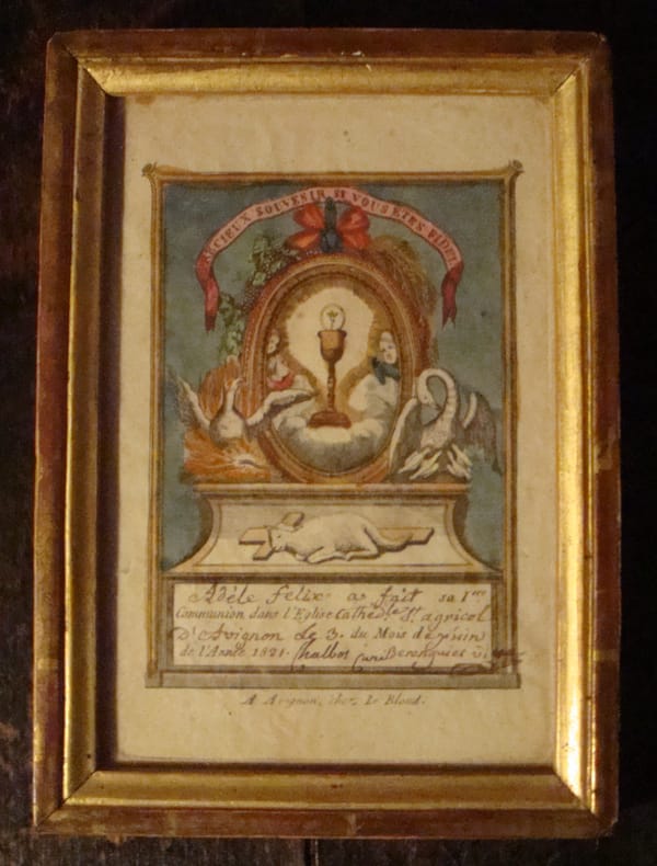 Souvenir de communion délivré en l’église de saint Agricol à Avignon. Cadre d’époque en bois doré; vitre ancienne. Avignon Leblond 1821 15 x 10 cm + cadre.