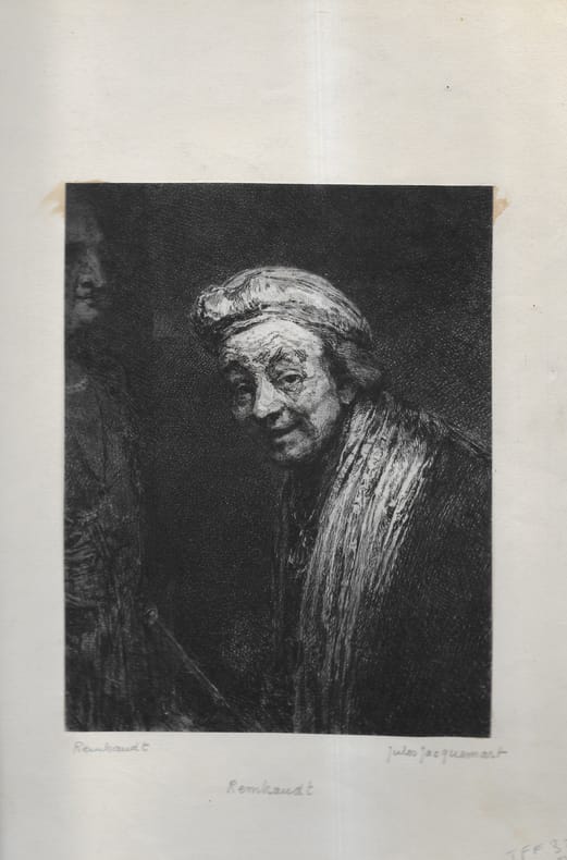 S.N. S.L. S.D. (XIXe) Tirage XIXe sur papier vergé du quatrième état de cette gravure originale de REMBRANDT, sous verre avec encadrement de bois noir. Mesures : Haut. à la cuvette en cm : 15,0. Larg. à la cuvette en cm : 11,3. Haut. en cm : 19,7. Larg. en cm : 16,7. Haut. avec montage en cm : 45,0. Larg. avec montage en cm : 32,0. B. 24-1630. 4e état ( sans la main ). La lettre B désigne le numéro de la classification de Bartsch. La date suit, quand il y a lieu. La mention Dutuit se réfère à l'uvre gravée de Rembrandt, par Eugène Dutuit. Très bel état.