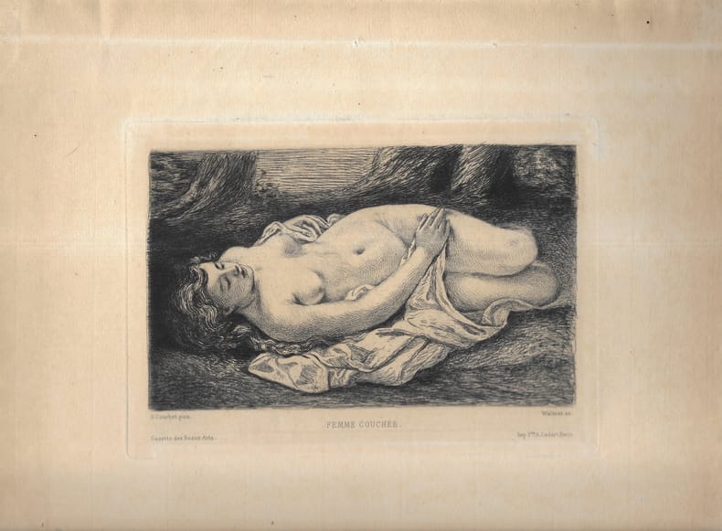 Belle épreuve bien contrastée. Première pensée de la femme au perroquet de Courbet. Paris Gazette des Beaux-Arts 1878 9,8 x 16,1 cm au trait carré. Papier 21 x 28 cm.