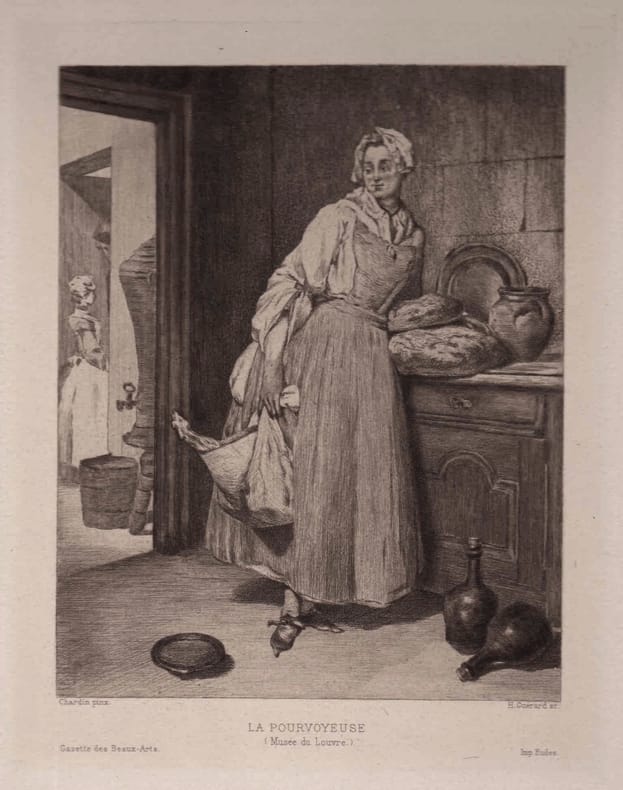 Belle épreuve en noir bistré sur Vergé. D'après Chardin. Sanchez et Seydoux 1888-11. en feuille Paris Gazette des Beaux-Arts 1888 19,5 x 15,5cm.
