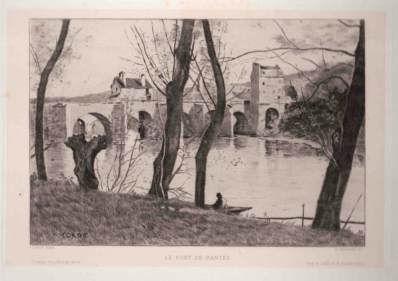 1846 Le Pont de Mantes (de la collection de Mr Defoer) gravé par Henri GUÉRARD (Paris 1846 – Paris 1897) d’après le tableau de Camille COROT (Paris 1796 – Paris 1875)- Feuille : 190 x 265 mm- Coup de planche : 165 x 230 mm,sur chine collé,bon état.