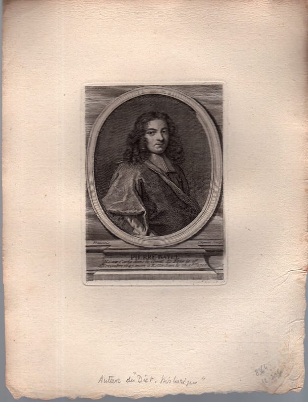 Amsterdam [Trevoux], Compagnie des libraires, 1734 1734 5 volumes in-folio, plein veau marbré et glacé de l’époque, dos à nerfs, caisson ornés, roulettes et dentelles, double filet en coupes, 2 ff.- XXIV- CXX- 857 pp. ; 2 ff.- 1004 pp. ; 2 ff.- 904 pp ; 2 ff.- 985 pp. ; 2 ff.- 887- 1- 103- 1 pp. Portrait de Pierre Bayle en frontispice d'après Petit, une vignette gravée sur cuivre sur chaque titre, et une gravure à mi-page en tête de l'épître au duc d'Orléans, dessinée et gravée par Picart et datée 1720. Coiffes de têtes usées, coins lég. émoussés, Humidité marginale et petits effrangements en têt des 2 premiers volumes, plus marquée au second, légère en fin de troisième volume. Par ailleurs très bon.