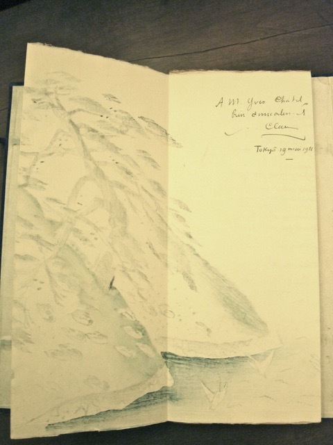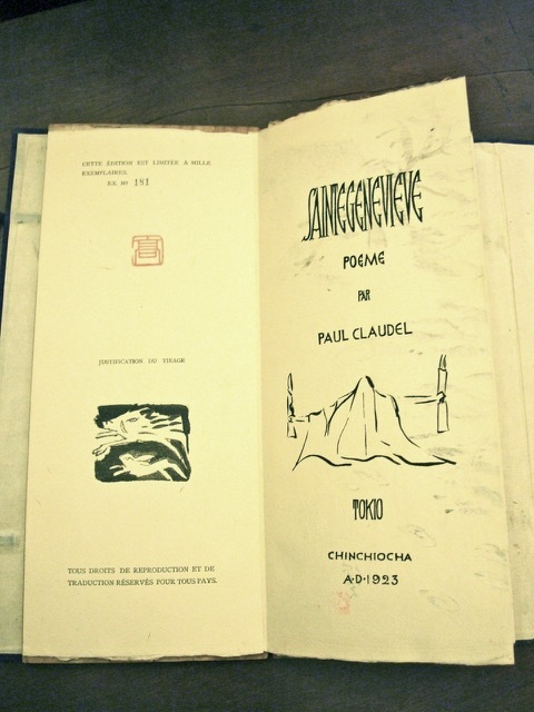 Illustrations de Audrey Parr gravées par Bonkotsu Igami; dessin au verso par Keisen Tomita avec un poème de Claudel en fac-similé. Magnifique ouvrage d'un tirage à mille exemplaires numérotés; celui-ci (n° 181) est enrichi d'un envoi autographe de Claudel daté du 19 mai 1923 à Tokyo. Il n'aurait été tiré en réalité que 312 exemplaires. Reliure japonaise en accordéon sous ais de bois, dans un boîtier de toile de lin comportant 2 attaches en ivoire. Infime défaut au plat inférieur et boîtier sali. Très bon Tokyo Chinchiocha 1923