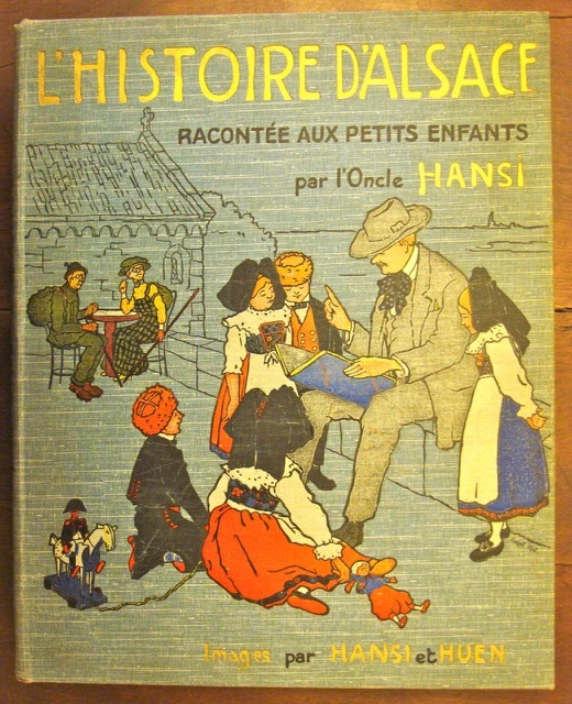 Paris, H. Floury, impr. Kapp 1913 In-folio. Cartonnage éditeur pleine percaline bleu-vert, premier plat orné d’une belle plaque polychrome signé Engel montrant le narrateur entouré d'enfants, avec report auteurs et titre en lettres noires & ors, profil de la cathédrale de Strasbourg en médaillon sur le second plat, dos lisse titré or, tranches rouges, 100 pp., nombreuses illustrations couleurs de Hansi et de Huen. Dos passé, coiffes et coins émoussés et frottés, charnières intérieur fendillées, intérieur frais.