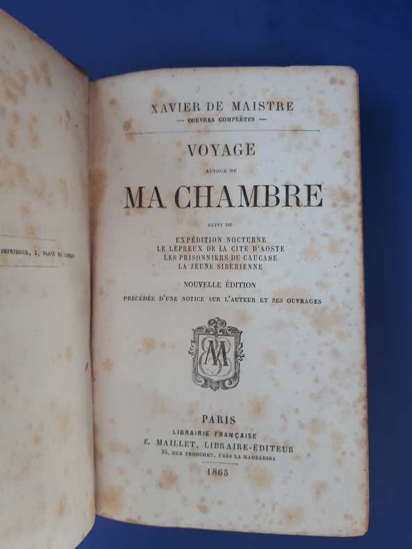 Editeurs F.Maillet. 1865 Suivi de : - L'expédition nocturne - Le lépreux de la cité d'Aoste - Les prisonniers du Caucase - La jeune Sibérienne. Nouvelle édition In-12° de 238 pp., précédée d'une notice de Alfred Des Essarts sur Xavier de Maistre.