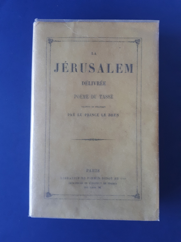 Paris, J.-B.-G. Musier, fils, Libraire, 1774 ; in-12, 6-380 pp. + frontispice, 2-376 pp., reliures d'époque demi cuir, dos lisse orné (dos en mauvais état) pièce de titre bordeaux. Traduction nouvelle par Charles-François Lebrun, troisième consul, duc de Plaisance…Torquato Tasso, dit le Tasse, célèbre poète italien de la Renaissance, naquit en 1544 à Sorrente et mourut en 1595 à Rome. Il publia de nombreux ouvrages. Il est intéressant de noter que ce poème italien, la Jérusalem délivrée (1575) se trouve facilement, alors que son pendant, la Jérusalem conquise (1593) est quasiment introuvable en édition moderne ou ancienne. Il s’agit pour le présent volume d’une nouvelle traduction, rédigée en 1581, récit de la Première Croisade, durant laquelle les chrétiens menés par Godefroi de Bouillon réussirent à prendre Jérusalem aux musulmans. Bon état.