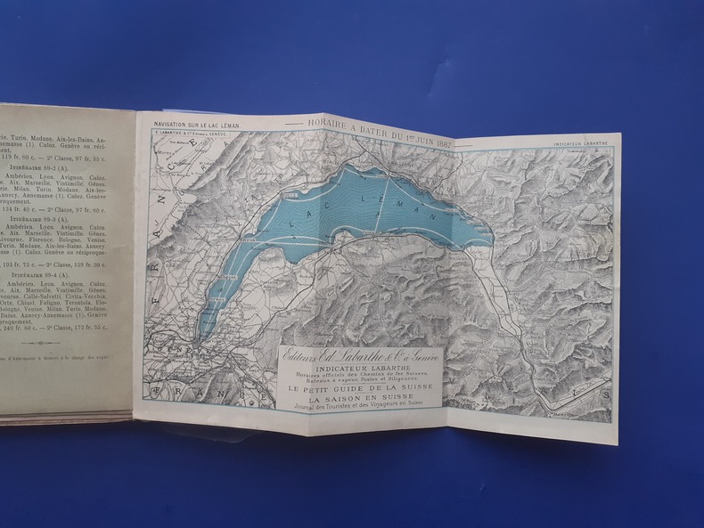 Genève, H. Trembley, 1887, in-8vo, 16 p. n. n. (publicités) + XXVIII + 256 p., + une carte dépliante (navigation sur le Lac Léman), + 1 plan (Lac Léman), reliure en demi-toile.