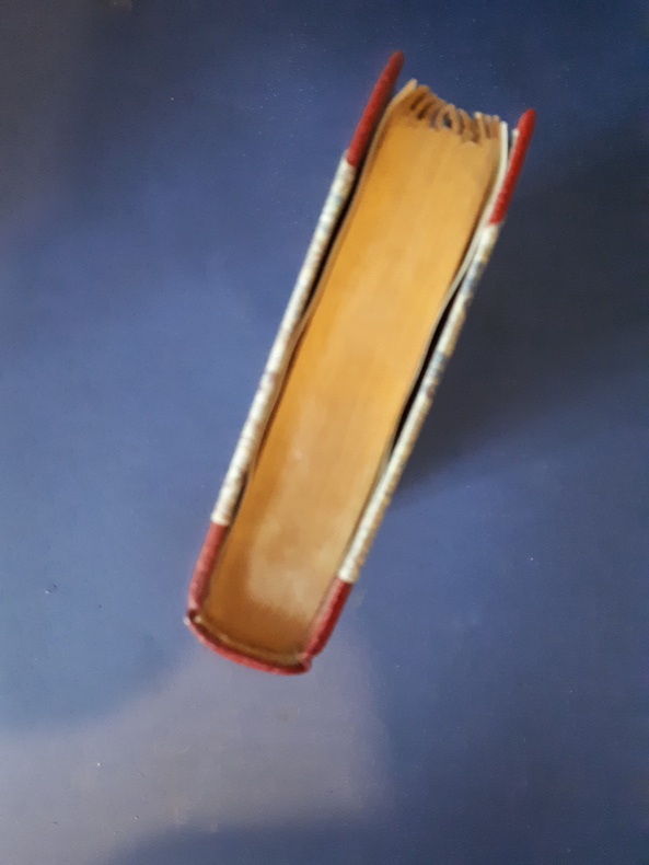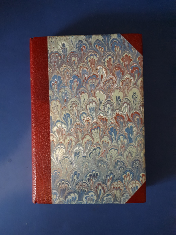 Exemplaire du tirage courant dans une singulière et unique reliure de l'époque signé Jéha, artisan non répertorié : cartonnage peint au pochoir en couleurs, lettre or au dos, gardes de papier marbré (Jéha). Assez bon 0