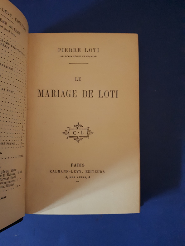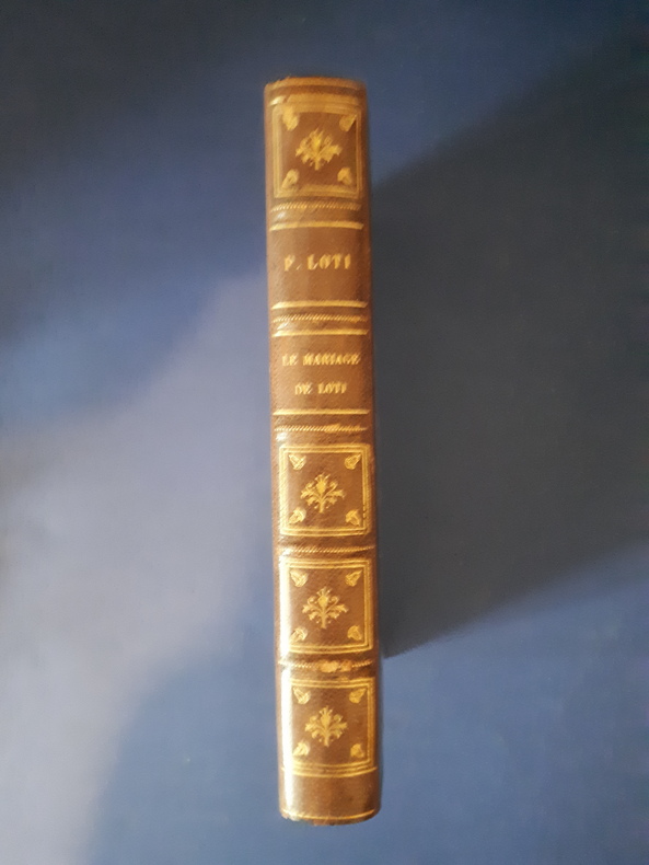 Reliure demi à coins. Dos légèrement insolé. Pierre Loti est un écrivain et officier de marine français, né en 1850 et mort en 1923. Une grande partie de son œuvre est d'inspiration autobiographique, il s'est nourri de ses voyages pour écrire ses romans. le mariage de Loti est un roman autobiographique, c'est le deuxième roman de Loti et le premier à lui gagner une grande renommée et un large public. Il décrit la liaison romantique de Loti avec une jeune fille exotique tahitienne nommée Rarahu.