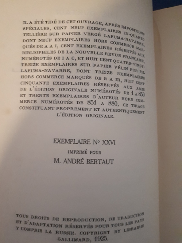 Un des 100 exemplaires numéroté sur Vélin Pur Fil Lafuma-Navarre réservés aux Bibliophiles de la nouvelle revue Française et constituant l'edition originale.