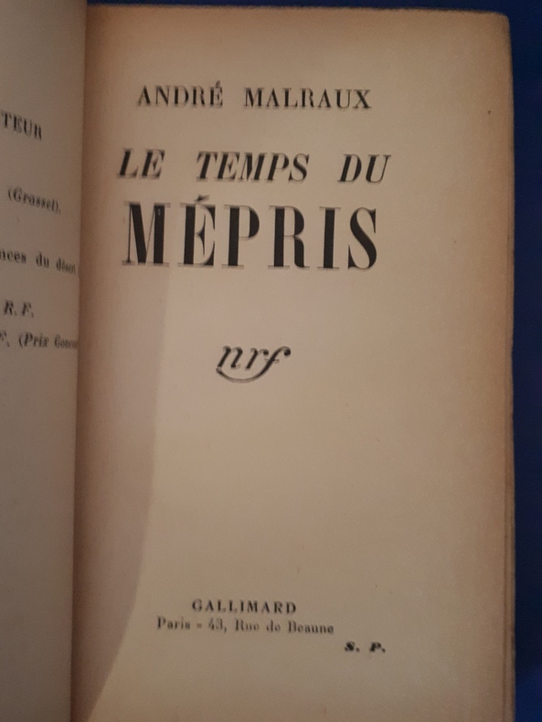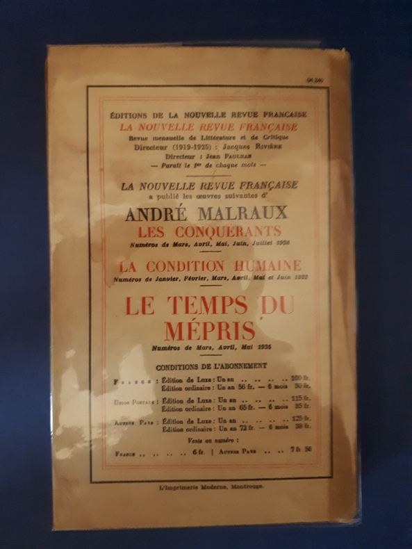 Edition originale publiée dans la collection "Blanche" de la N.R.F. achevée d' imprimer le 15 mai 1935. Exemplaire du Service de Presse après 250 sur Alfa, 297 sur Vélin, 31 sur Hollande, 11 sur Japon et 8 exemplaires sur Chine numérotés. Réf AA511