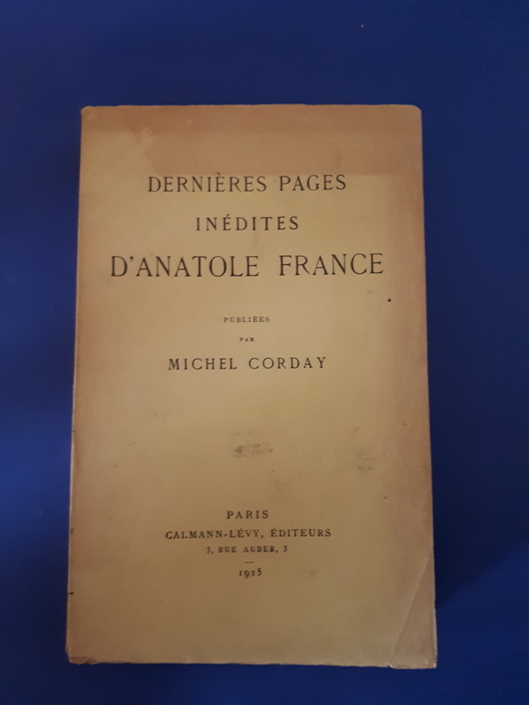 Calmann-Lévy Paris 1925 FRANCE Anatole.Dernières pages inédites d'Anatole France publiées par Michel CORDAY.Paris. Calmann-Lévy. 1925.Grand in-12 carré ( 20 / 20 cm ) plein chagrin lie de vin. Dos lisse orné de filets dorés en place des nerfs. Titre doré. Filets dorés encadrant les plats. Large guirlande dorée en contre-plat. Tête dorée.Reliure signée Dunand - Pinard.Exemplaire à grandes marges conservées.Ex-libris imprimé en contre-plat de M. Lugol.Ex-libris japonisant au tampon en page de garde.Couvertures et dos conservés.Exemplaire n° 21, un des 125 sur papier Impérial du Japon, seul grand papier.197 pages.Au lecteur. Des dialogues intitulés "sous la rose". Dialogue sur la métaphysique et l'existence de dieu. Les personnages supprimés. etc...