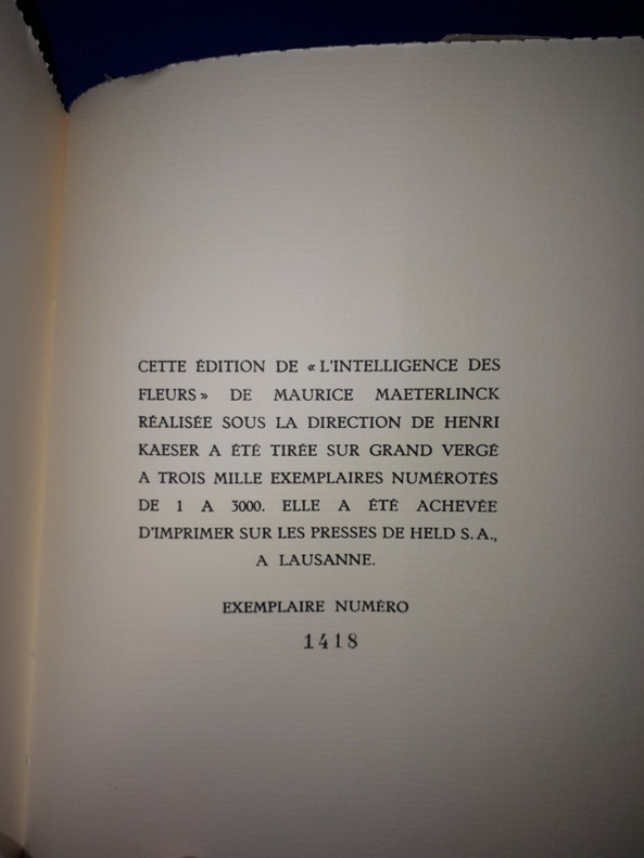 1 Paris, Éditions du Reflet, 1955. 33 x 25,5 cm, 136-[8]-2f.b. En feuillets, sous couverture imprimée à rabats en papier incrusté de fleurs séchées, sous emboîtage. L'exemplaire est en très bel état, seul l'emboîtage est légèrement usé. Édition illustrée de gravures originales au burin de Tavy Notton, tirage limité à 201 exemplaires plus 20 h.-c. tirés en outre, réservés à l'artiste et aux collaborateurs. Le nôtre un des 14 ex. num. sur Auvergne à la main (après 22 ex. sur Japon) comprenant une suite sur Rives blans, une suite sur vélin teinté, une suite bistre sur Rives teinté et un tirage sur soie de 6 planches doubles.