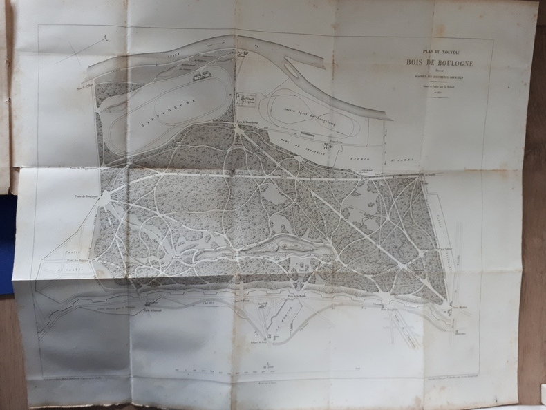 In-8° de 221 pp., (1)f. de table, 1 plan Paris, A. Fontaine, 1855, plan dépliant du Bois de Boulogne, dressé d'après les documents officiels, gravé par Th. Delsol. Première édition de cette notice sur le Bois de Boulogne, autrefois nommé la forêt de Rouvret à cause du chêne rouvre qui en formait l'essence dominante.