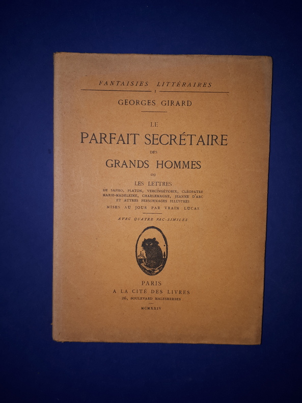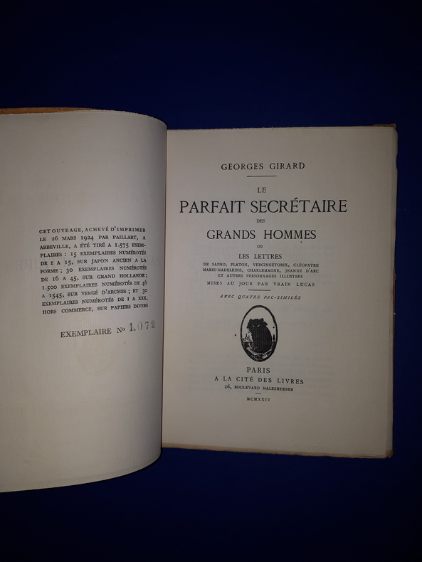 ition originale numérotée sur vergé d'Arches. Ce livre retrace l'histoire du merveilleux escroc et faussaire Vrain Lucas qui proposait au trop crédule le mathématicien Michel Chasles des vraies fausses lettres de Platon, Cléopâtre, Newton, Rabelais, Jeanne d'Arc, Vercingétorix, Cléopâtre, Charlemagne, et même Jeanne d'Arc ! Avec quatre fac-similés de manuscrits.