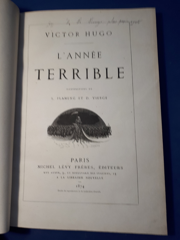 Une légère déchirure sans manque est à signaler sur la page de faux titre. L'Année terrible est un recueil de poèmes de Victor Hugo publié en 1872. Il retrace l'année 1870-1871, durant laquelle la France voit, à la suite de la défaite de la France lors de la guerre contre la Prusse, le soulèvement de la classe ouvrière à Paris.