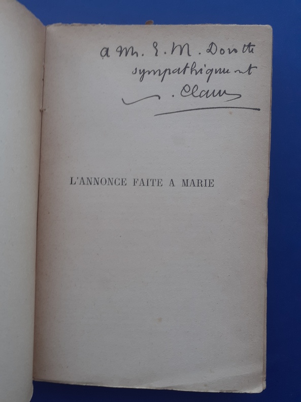 Deuxième oeuvre dramatique de Paul Claudel, la première à être mise en scène, L'Annonce faite à Marie initie en cela son théâtre et figure parmi ses pièces majeures avec Le Soulier de satin. Suivant son idée « qu'en art, il n'y a rien de définitif », Claudel remaniait voire réécrivait ses textes. Ainsi de la genèse de cette pièce dont le propos augural fut écrit dix ans plus tôt sous le titre La Jeune Fille Violaine, pièce elle-même remaniée en 1899 avant d'être réécrite entre 1910 et 1911 pour donner naissance à L'Annonce. Le 22 décembre 1912 a lieu la première sur la scène du théâtre de l'OEuvre. Claudel prendra une part importante comme metteur en scène aux côtés de Lugné-Poe, jusqu'à rédiger un manifeste théâtral. S'il n'y a que trois représentations, le public d'initiés qui s'y rendit sut s'en faire l'écho. L'Annonce est un succès, alors que le texte a paru quelques mois plus tôt (avril 1912) en volume et dans La NRF (n° 36 à 40). André Gide incite la jeune maison des Éditons de la NRF à un retirage : « Qu'avons-nous décidé de faire pour les représentations de L'Annonce faite à Marie ? Rien ? Il serait tout de même bon qu'on pût trouver le livre à acheter dans les couloirs. Bon et presque indispensable - autant pour Claudel que pour nous. » Passé dans la bibliothèque de Raoul Simonson, cet exemplaire a été précieusement établi dans le pur style « janséniste » où le décor n'apparaît qu'une fois le livre ouvert. Les contreplats de maroquin ivoire richement ornés comportent le chiffre « MM » répétés aux quatre angles. Nous pouvons émettre l'hypothèse que cette reliure fut commandée par le bibliophile Marcel de Merre dont le goût pour Claudel était prononcé. Il possédait en outre l'édition illustrée par Maurice Denis de L'Annonce faite à Marie dans une spectaculaire reliure de Paul Bonet. Si notre exemplaire n'est pas passé en vente lors de la dispersion de sa collection (Sotheby's, 2007), il est cependant acquis que Marcel de Merre fit régulièrement travailler Huser, en usant de ce monogramme pour les pièces de grande qualité. Des bibliothèques Raoul Simonson (ex-libris) et Marcel de Merre (monogramme doré au décor du contreplat). P. Boudrot & H. Vignes, Bibliographie des Éditions de la Nrf, 20.