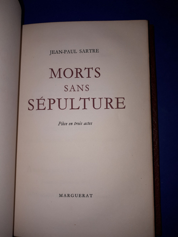 Edition originale. - 1/60 exemplaires numérotés sur vélin du Marais pur fil. - La pièce, qui met en scène des résistants français fait prisonniers par des miliciens, parle de la torture et de la liberté humaine. Elle est créée à Paris la même année et fait scandale; Sartre doit faire des coupures. - Non coupé. Bas dos émoussé.