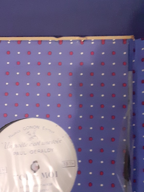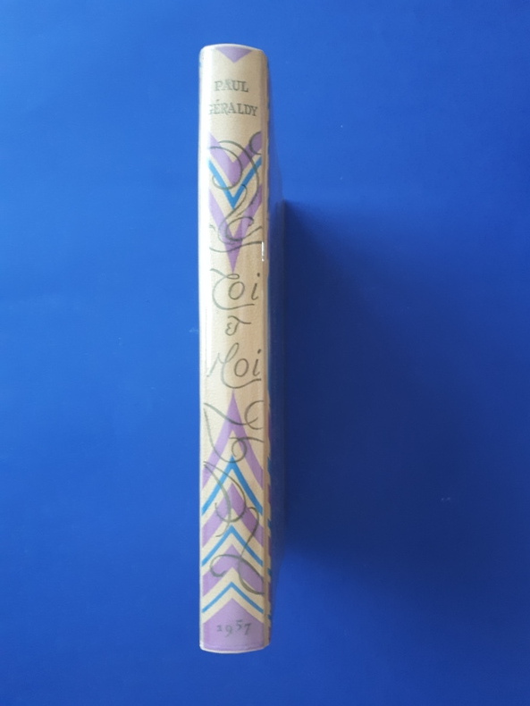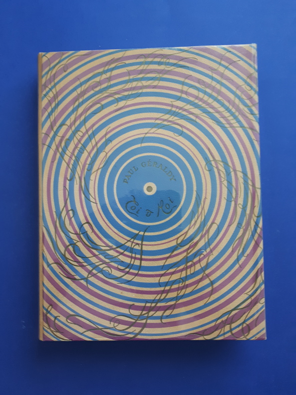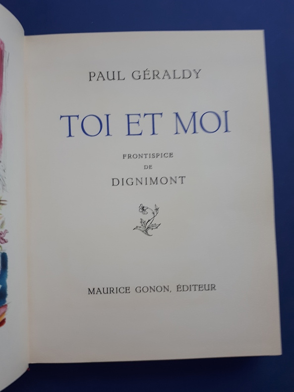 Cartonnage d'éditeur en percaline polychrome sous rhodoïd. Dos lisse avec titre et mention d'auteur dorés. Date dorée au talon. Excellente conservation de la reliure. Frontispice en couleurs réalisé par Dignimont. Culs-de-lampe gravés par G. Aufschneider. Un des 3000 exemplaires numérotés sur grand vélin. Nouvelle édition - limitée - du recueil de poème de Paul Géraldy, contenant un disque 45 tours enregistré par l'auteur contenant les 10 poèmes suivants : Expansions, Tristesse, Abat-jour, Chance, Dualisme, Lettre, Bruit de voix, Passé, Sagesse, et Mort du baiser.Le poème inédit Absence est également propre à cette édition. IL EST A NOTER UN CHOC SUR LA TRANCHE SUPERIEURE, le livre est donc vendu en l'ETAT AB205